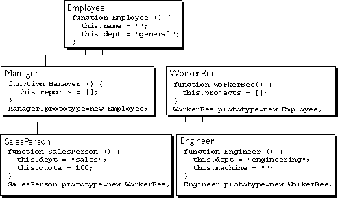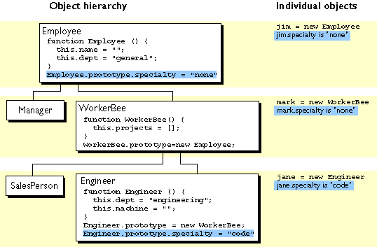 The Engineer and SalesPerson definitions create objects that descend from WorkerBee and hence from Employee. An object of these types has properties of all the objects above it in the chain. In addition, these definitions override the inherited value of the dept property with new values specific to these objects.